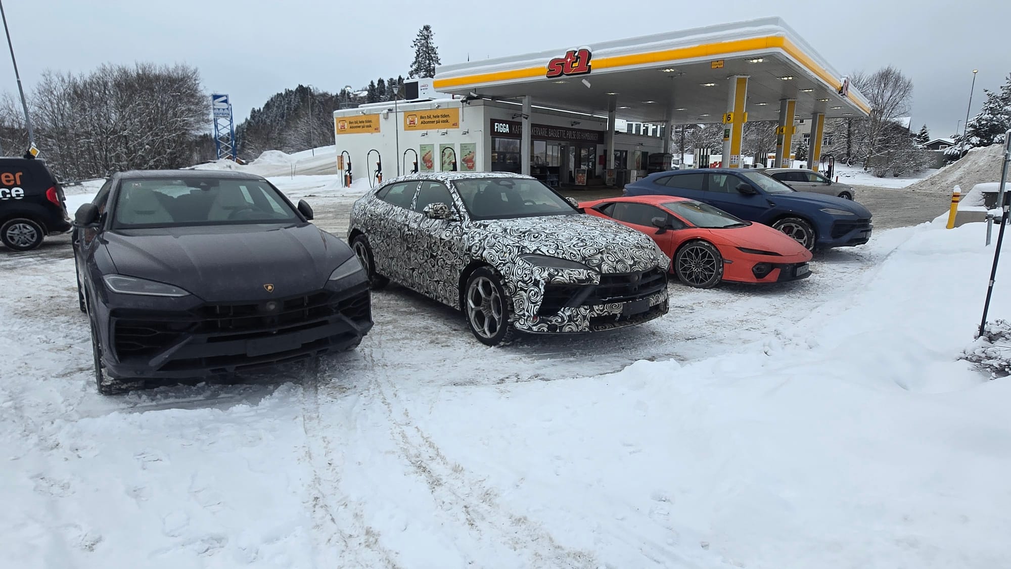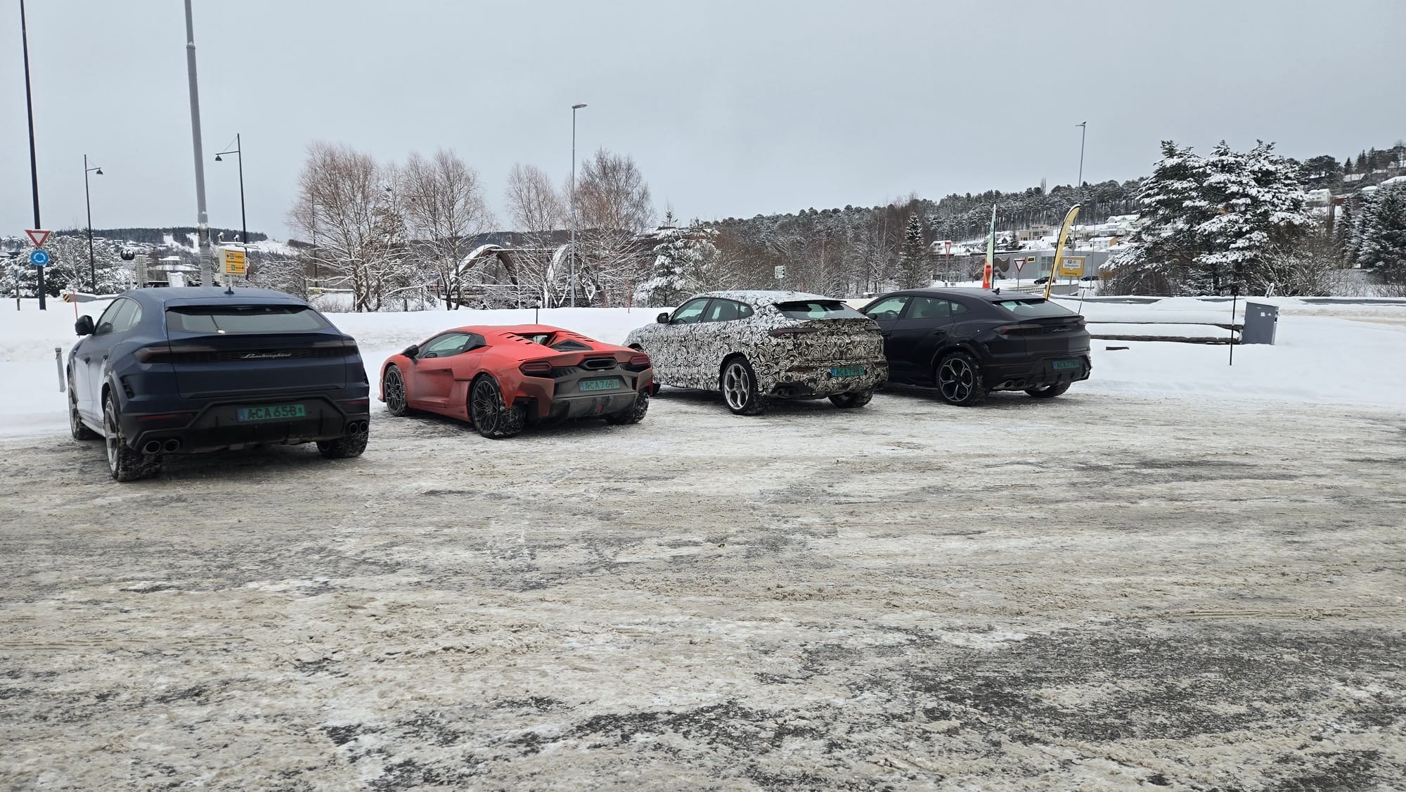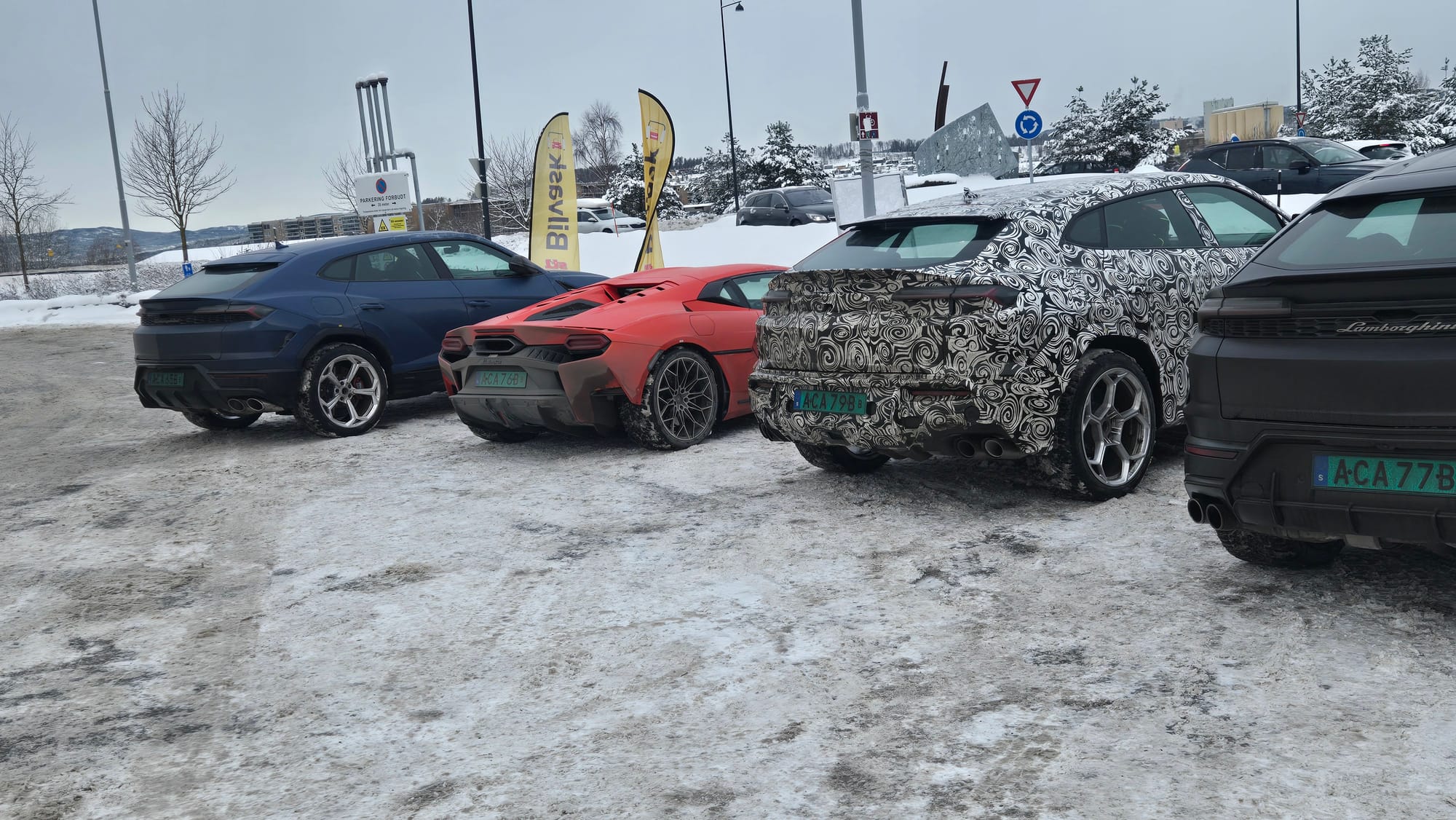 I en uvanlig scene på ST1-stasjone i Steinkjer ble flere eksklusive sportsbiler nylig observert. Blant dem fant vi den velkjente Lamborghini Urus, den rødglødende Lamborghini Aventador og en mystisk bil dekket i kamuflasjefolie – en mulig prototype eller testmodell.