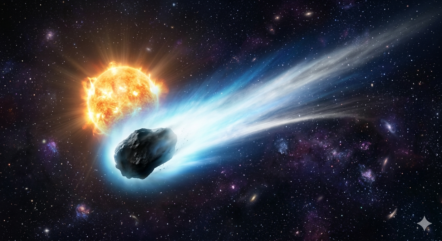 Når en komet nærmer seg solen, blir den varmet opp. Isen på kometen begynner å fordampe, noe som skaper den kjente komethalen.